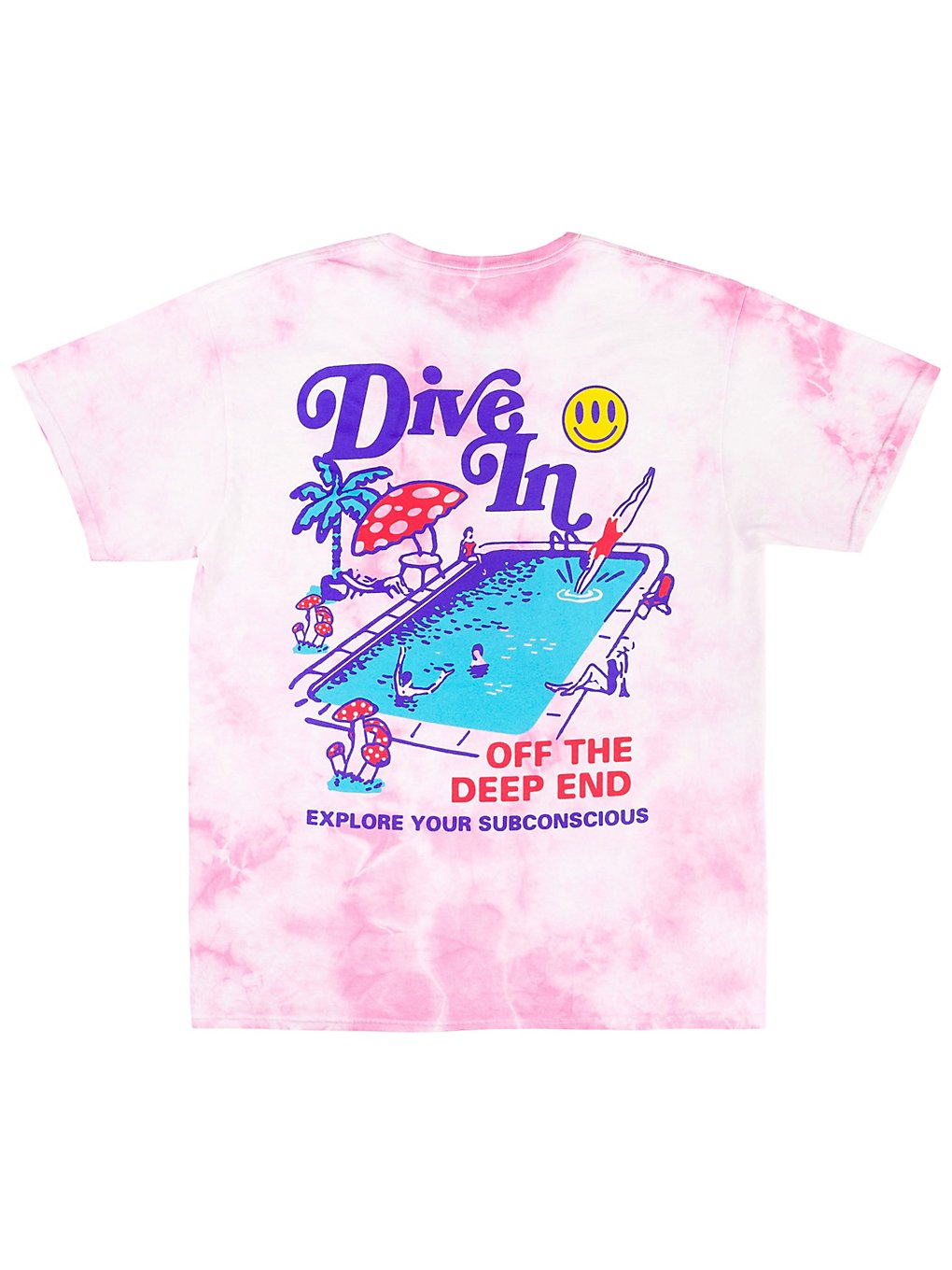FeaturesT-Shirt for men from A-Lab.screen-printed “dive in” script on the left chestlarge pool graphic on the backpink tie-dye colorway throughout.ribbed crew neck collarcustom dye treatment used, color and design may varyrelaxed fit