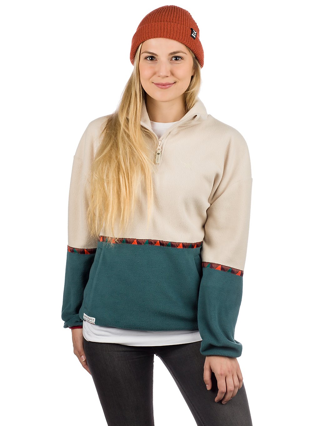 FeaturesColor block polar fleece troyer by Iriedaily Decorative tapeFront pockets with hidden press buttonsSmall logo embroidery on frontVegan