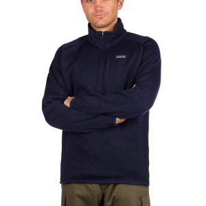 FeaturesMen’s fleece sweater by Patagonia Made of 100% recycled polyester fleece with sweater-knit face, fleece interior and heathered yarnsDyed with a low-impact process that significantly reduces the use of dyestuffs, energy and water compared to conventional dyeing methodsQuarter-zip with zip-through, stand-up collarZippered left-chest pocket is headphone-compatibleShape-holding micropolyester jersey trim at cuffs and hem resists abrasionFlat-seam construction reduces bulk and helps eliminate seam chafeHip lengthFair Trade Certified™ sewnWeight: 505 g (17.8 oz)